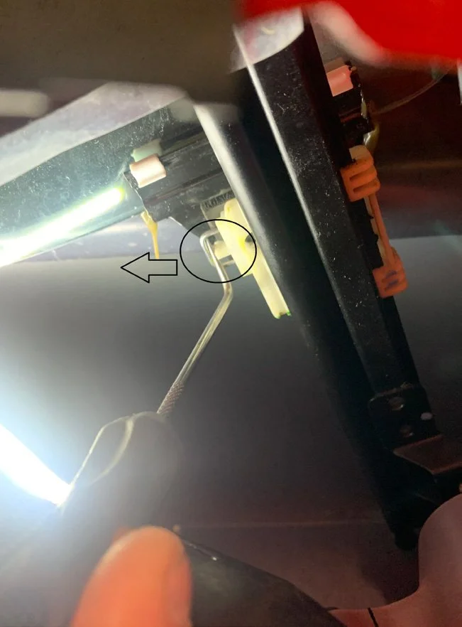 Step 8: While looking into the speaker hole, lower the window down until you see the clip that is holding the window to the inner window track (photo below). Use a pick tool and pull the clip away from the window track, being careful not to lose the clip.