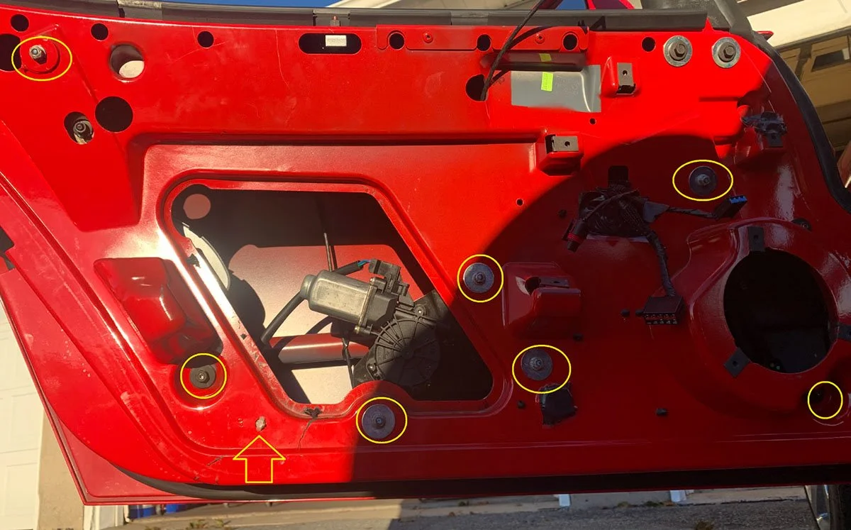 Step 12: Remove the 7 nuts holding the window regulator and track assembly (yellow circles on photo below).
